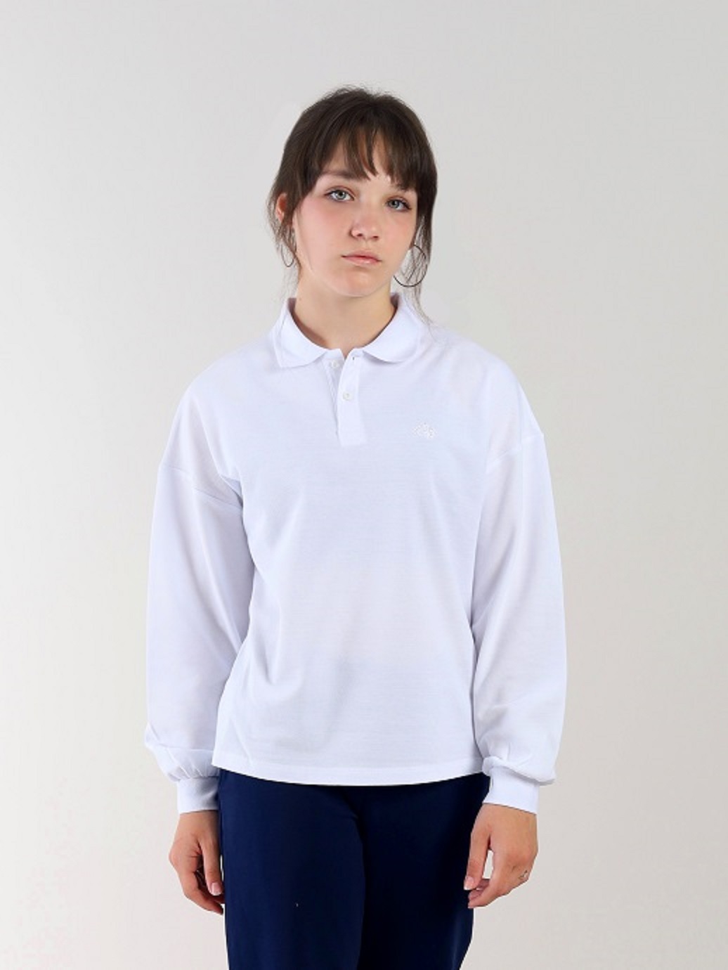 Джемпер-поло из пике для девочки, с длинными объемными рукавами, свободного силуэта, спущенным плечом и отложным воротником. Спереди застежка на пуговицы. Спереди декорирован вышивкой.Дополнительно