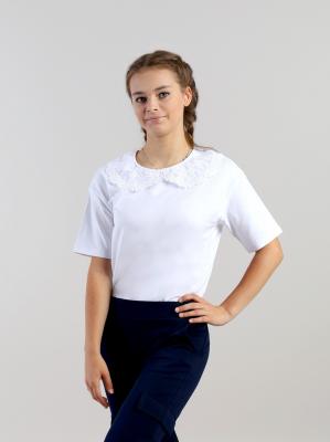 Джемпер для девочки свободного силуэта с короткими рукавами. Горловина круглая, оформлена декоративным воротником из кружева. В верхней части спинки обработана застежка "капелька" на пуговицу.Дополнительно