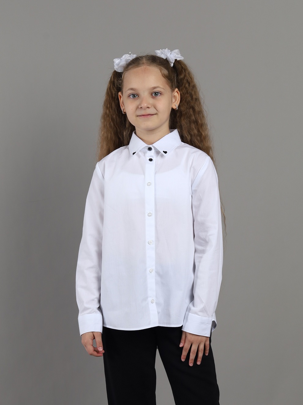 Классическая блузка из хлопка, свободного силуэта с отложным воротником и длинными рукавами с манжетами. Застёжка центральная на планку с пуговицами, декорирована вышивкой ввиде сердечек на воротнике.Дополнительно
