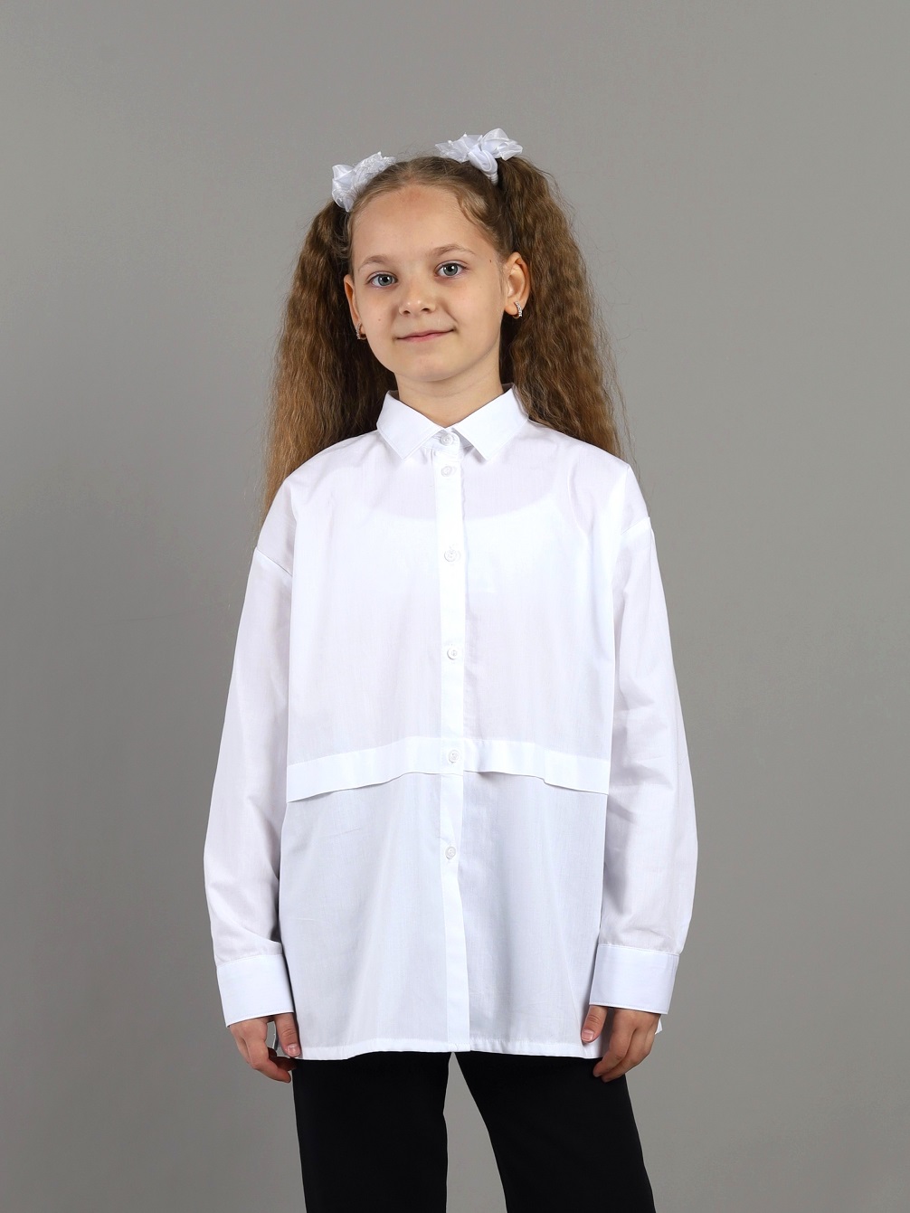 Удлиненная оверсайз блузка из хлопка, свободного силуэта с отложным воротником и длинными рукавами. Застёжка центральная на планку с пуговицами. Спереди декоративная поперечная складка.Дополнительно