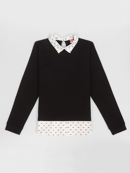 Джемпер с длинными рукавами из футер без начеса. Горловина круглая, обработана отложным воротником из сорочечной ткани. На спинке обработана застежка "капелька" на пуговичку. Рукава с манжетами по низу. Нижние срезы переда и спинки обработаны притачными деталями из сорочечной ткани, создающими ощущение двухслойного изделия.Дополнительно