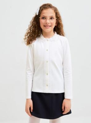 Белая школьная блузка с воротничком для девочек. Прилегающий силуэт. Рукава без манжет. Застёгивается на ряд кнопок в виде искусственных жемчужин с золотистой каймой. Центральная планка с нежной кружевной отделкой. Отложной несъёмный воротничок выполнен из кружева. Большой процент хлопка в составе позволяет коже дышать и не требует сложного ухода. Блузка легко станет частью базового гардероба, а в сочетании с брюками или юбкой составит стильный деловой образ.Дополнительно