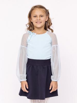 Джемпер с длинными рукавами-реглан из сетки с рисунком. Рукава со швом чуть выше локтя. Нижняя часть рукава более объемная, чем верхняя, со сборками по шву притачивания и низу. В области горловины джемпер декорирован настрочным многослойным бантом.Дополнительно