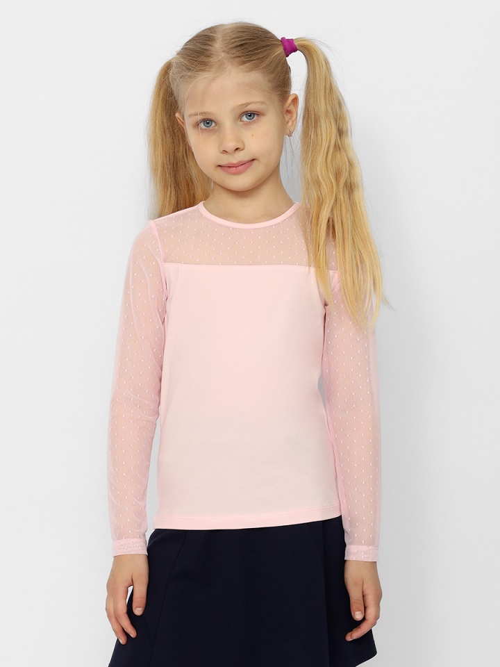Джемпер с длинными рукавами и кокеткой из сетки с рисунком. Сзади обработана застежка "капелька". Горловина окантована.Дополнительно