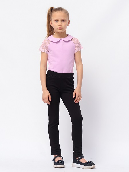 Джемпер для девочки с короткими рукавами-реглан. Горловина обработана обтачным фигурным воротником из основного полотна. В верхней части спинки обработана застежка "капелька". Рукава выполнены из эластичного кружева с фигурным краем.Дополнительно