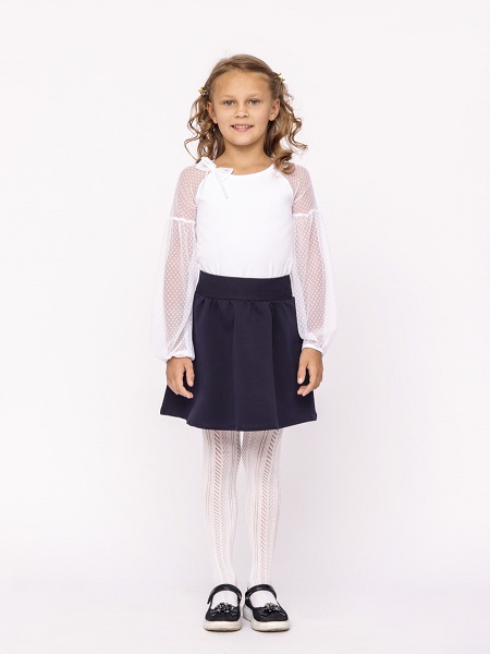 Джемпер с длинными рукавами-реглан из сетки с рисунком. Рукава со швом чуть выше локтя. Нижняя часть рукава более объемная, чем верхняя, со сборками по шву притачивания и низу. В области горловины джемпер декорирован настрочным многослойным бантом.Дополнительно