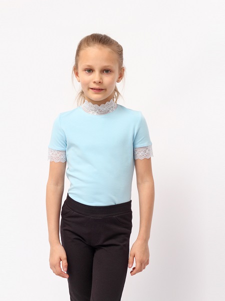 Водолазка для девочки с короткими рукавами. Воротник-стойка выполнен из эластичного кружева. Нижние срезы рукавов так же отработаны эластичным кружевом.Дополнительно