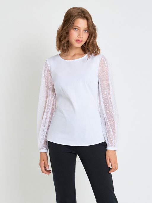 Элегантная блузка с длинными рукавами-фонариками из сетки для девочек-подростков. Сшита из хлопкового поплина - натурального, дышащего и износоустойчивого материала. Прилегающий силуэт. Округлая горловина. Застежка на пуговицу сзади.Отличный выбор для школы и торжественных мероприятий.