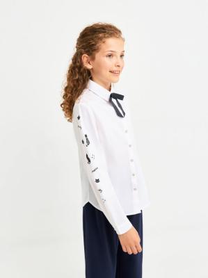 Белая блузка с интересным принтом на рукавах из школьной коллекции для девочек. Сшита из натурального хлопка - дышащего и приятного к телу материала. Прямой силуэт. Длинные рукава. Центральная застежка на металлические кнопки. Воротник стояче-отложной. Съёмный бантик черного цвета в комплекте.Дополнительно