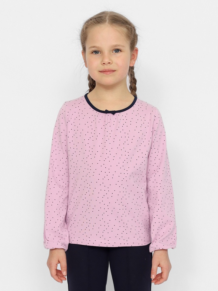 Джемпер для девочки с длинными рукавами из набивной кулирки. Низ рукава и горловина обработаны контрастной бейкой. Сзади застежка на пуговицу.Дополнительно