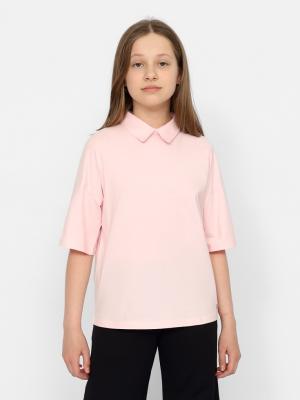 Джемпер для девочки с короткими рукавами, свободного силуэта, спущенным плечом и отложным воротником. Сзади застежка на пуговицу. Спереди декорирован металлическим лейблом.Дополнительно