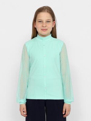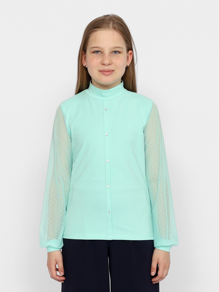 Водолазка для девочки с длинными рукавами и воротником-стойкой. Рукава из сетки с манжетами из кулирки. Полочка с иммитацией застежки на пуговицы.Дополнительно