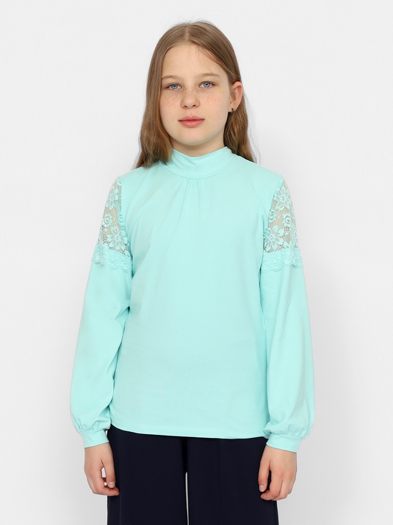 Водолазка для девочки с длинными рукавами и воротником-стойкой. На рукавах декоративные вставки из кружева. Снизу рукава манжеты из кулирки.Дополнительно