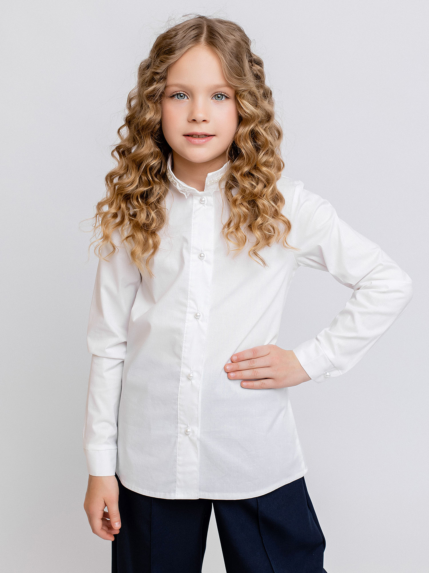 Блузка для девочки с длинными рукавами и тесьмой на воротнике. Застежка на петли пуговицыДополнительно