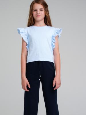 Футболка трикотажная прямого силуэта. Цельнокроенные рукава декорированы воланами. Высокое содержание хлопка 95%. Благодаря наличию эластана в составе ткани, изделие проще в уходе и держит форму.Дополнительно