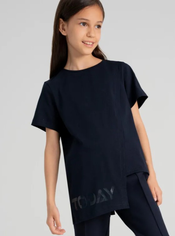 Футболка трикотажная прямого силуэта. Ассиметричный перед. Высокое содержание хлопка 95%. Благодаря наличию эластана в составе ткани, изделие проще в уходе и держит форму.Дополнительно