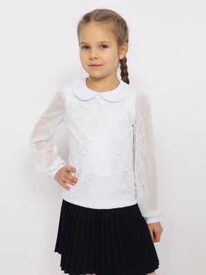 Джемпер для девочки с длинными рукавами и отложным воротником. Рукава из сетки с манжетами из кулирки. Полочка двойная - нижний слой из кулирки, верхний из сетки. Сзади застежка на пуговицу.Дополнительно