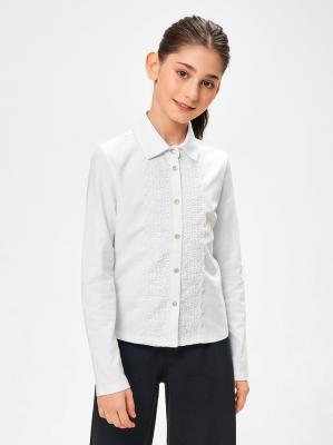Белая школьная блузка для девочек из мягкого трикотажа удобно садится на любой тип фигуры. Высокий процент гипоаллергенного хлопка в составе позволяет коже дышать. Длинный рукав без манжет не сковывает движений. Застегивается на кнопки, декорированные перламутровыми половинками бусин. Центральная планка украшена кружевными вертикальными вставками. Дополните блузку прямыми брюками или юбкой, чтобы завершить деловой образ.Дополнительно