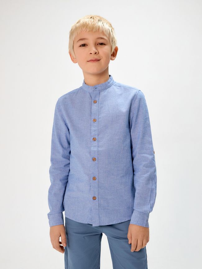 Детская рубашка для мальчика, выполнена из дышащей и мягкой хлопковой ткани, которая комфортна для ношения в течение всего дня. Классическая застежка на контрастные пуговицы и петли проста и удобна. Спинка с силуэтообразующей кокеткой. Короткий аккуратный воротник-стойка смотрится стильно и необычно. Длинные рукава с манжетами на пуговицах дополнены хлястиком для фиксации рукава в подвернутом виде, благодаря чему рубашка комфортна для ношения в тёплую и прохладную погоду. Узор в тонкую полоску приятно разнообразит аутфит. Стилизуйте рубашку с шортами и кедами для создания повседневного образа.Дополнительно