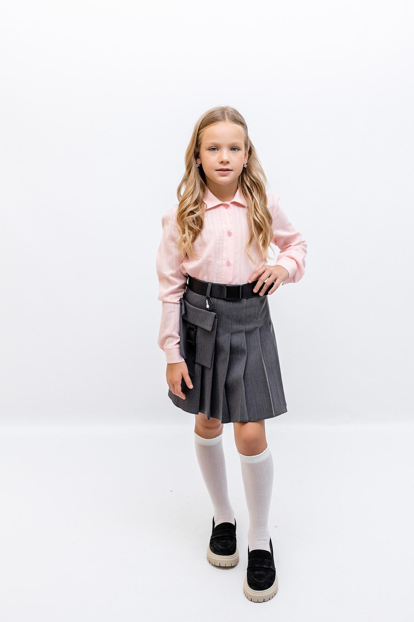 Короткая юбка в складку, серая - оригинальный вариант для девочек в школу. В боковом шве расположена потайная молния. Съемный карман-сумка и модный ремень-стропа.Дополнительно
