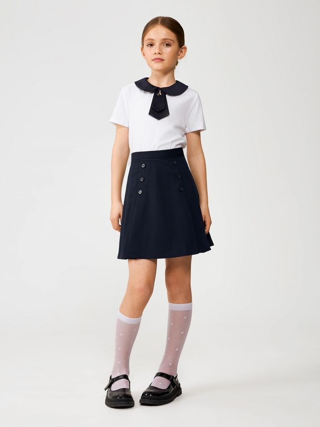 Детская юбка для девочек из школьной коллекции выполнена из костюмной ткани, которая отличается высокой износостойкостью и практически не сминается, обеспечивая удобство в повседневном ношении. По переду расположены четыре декоративные складки и шесть стильных пуговиц по центру, придающих изделию особый шарм.Эластичный пояс дополнен кантом с регуляторами, что позволяет сделать посадку удобной для любого типа фигур. Застёжка на молнию по боковому шву обеспечивает комфортное надевание и снятие, что особенно важно в дни занятия физкультурой. Расширенный к низу силуэт юбки дарит большую свободу движений, что важно для активных школьных будней.Стилизуйте изделие с белой рубашкой, гольфами и туфлями для создания современного стильного образа на любые школьные мероприятия. Юбка также идеально подходит для школьной формы.Дополнительно