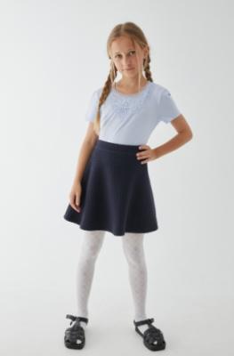 Темно-синяя юбка-клеш для девочек выполнена из плотного фактурного трикотажа с высоким содержанием хлопка. Мягкий, воздухопроницаемый и износоустойчивый материмал, который отлично сохраняет свою форму. Пояс регулируется при помощи резинки изнутри. Застежка-молния в боковом шве.Отличный выбор для школьных будней.