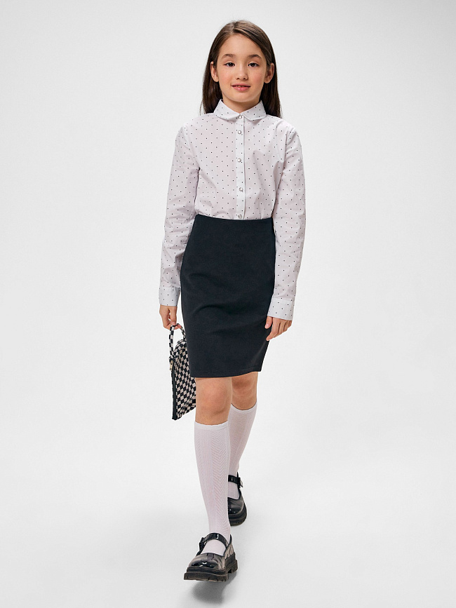 Школьная юбка для девочки. Выполнена из плотного вискозного трикотажа. Внутри пояса эластичная лента, позволяющая отрегулировать изделие по линии талии. Длина до колена. Стилизуйте юбку с блузками и рубашками в деловых образах. Также юбка может стать частью школьной формы.Дополнительно