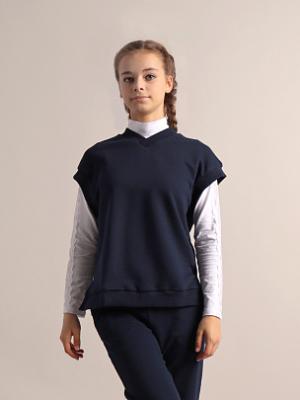 Школьный жилет оверсайз для девочки. Жилет выполнен из мягкого и приятного к телу футера, что обеспечивает комфортное ношение в течение всего дня. Благодаря своему свободному крою и широким проймам модель обеспечивает свободу движений. Акцентной деталью являются разрезы по бокам. Особенности жилета включают треугольный вырез горловины. Резинка на горловине и проймах добавляет модели дополнительную эластичность и обеспечивает идеальную посадку.Дополнительно